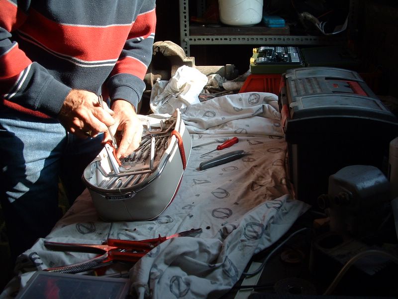 Opbouwen kan beginnen. De spanner voor de voor vering rubbers weer voor de dag gehaald en omdat dit de tweede keer is ging het een stuk vlotter. |
